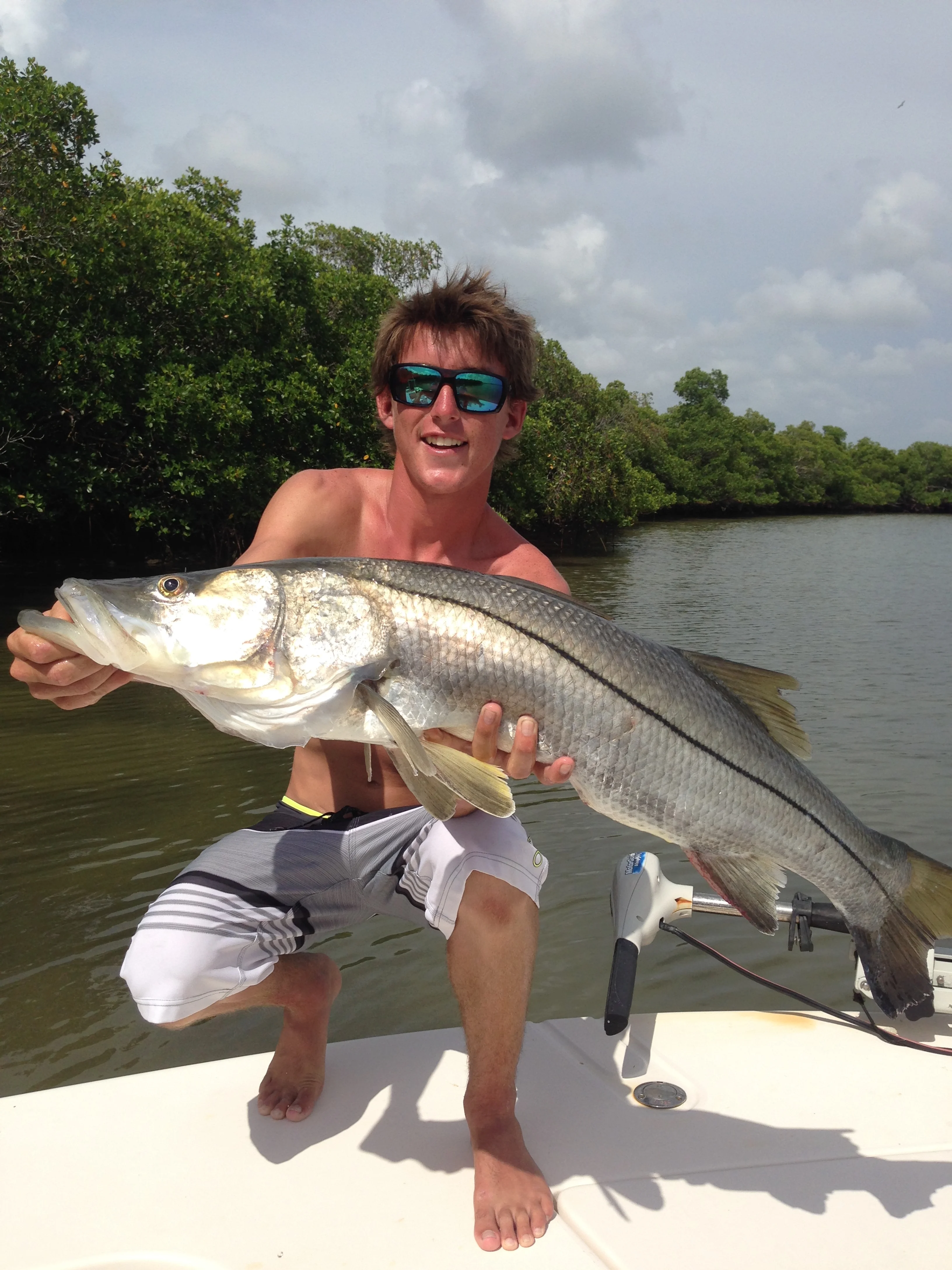 Enough said.... If there was ever a fish that needed to come with an instruction manual its this guy. From leading the fish with your bait or fly to dropping the rod when they jump. This is a very intense angling experience. Large Tarpon have the ability to make you beg for mercy. 100+lb fish are common and demand respect. Tarpon will eat a dead bait off the bottom and slurp a fly off the surface. Laid up fish in the backcountry look more like logs than fish in the muddy waters they love so much. Believe me though... when one jumps on your well placed bait you will think you have just awakened Godzilla! Tackle destroying, high flying and pure prehistoric muscle is what you're up against with an armor plated, triple digit behemoth. When you jump one these bad boys in shallow water you'll be booking your flight for next year before that fish hits the water again!